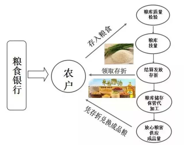 農民打下新糧,存入企業(yè)提供的糧倉,定期或活期自由選擇,并且享有利息,這個糧倉就作為“糧食銀行”為農戶提供代存代儲代加工糧食等服務,糧食銀行會給農戶發(fā)放 “糧食存折”,記錄著存糧日期、數量、取兌日期和余額等信息。農戶還可憑存折在鄉(xiāng)村各個網點兌換米、油或化肥、種子、農藥等各種農資。農戶走進糧食銀行,就好像走進了商業(yè)銀行的儲蓄所,只不過存取的內容從現金變成了糧食。