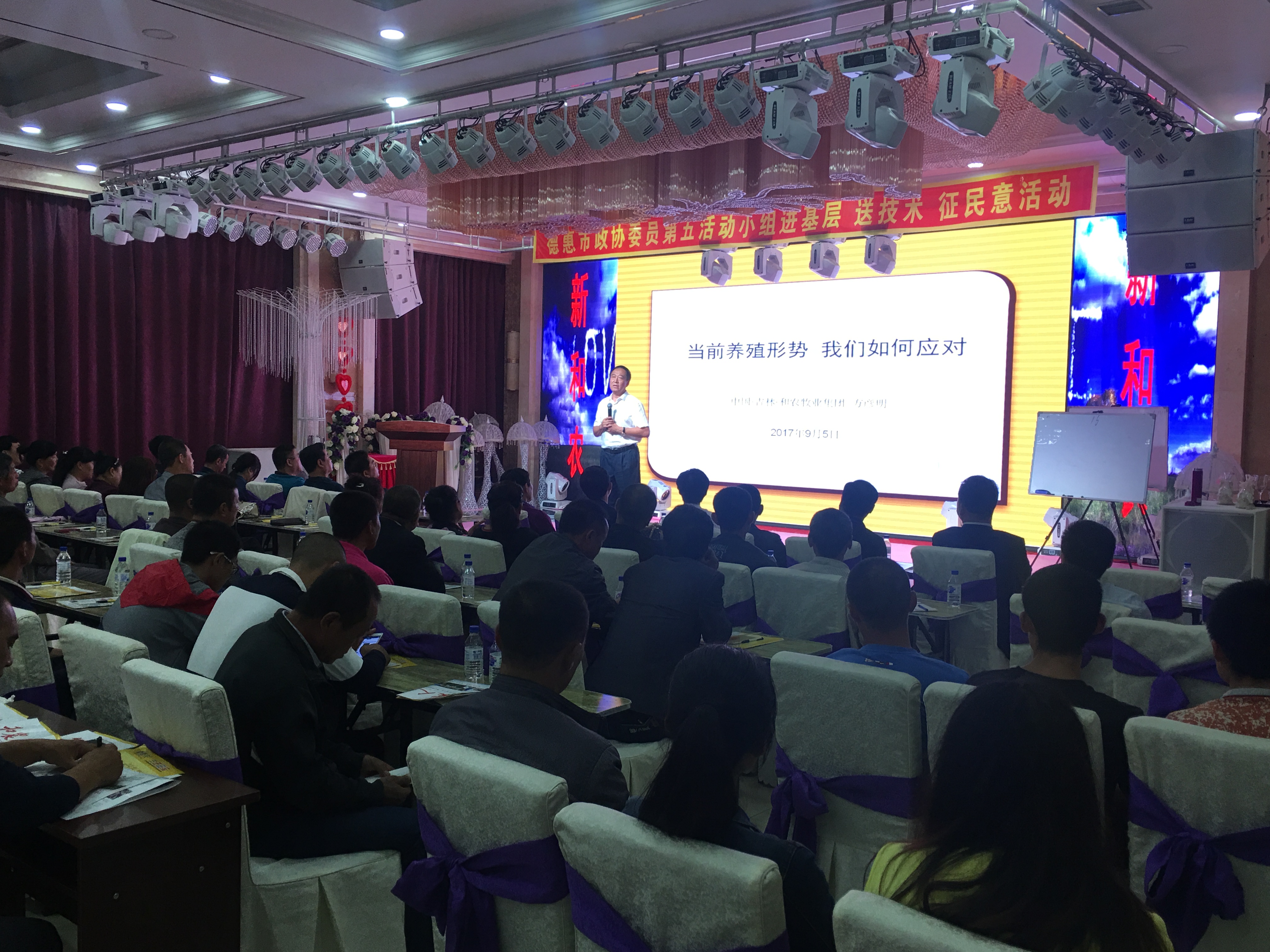 由和農(nóng)牧業(yè)集團主辦,德惠榮豐聯(lián)社、德惠市政協(xié)委員會協(xié)辦“新和農(nóng)蛋雞養(yǎng)殖雙卡新模式”送溫暖傳技術(shù)基層科普推介會在德惠華宴大酒店隆重召開,現(xiàn)場參會大型養(yǎng)殖場120人。