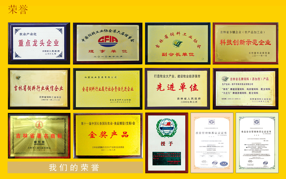 集團(tuán)先后被評為吉林省農(nóng)業(yè)產(chǎn)業(yè)化重點(diǎn)龍頭企業(yè)、牧業(yè)生產(chǎn)先進(jìn)企業(yè)、吉林省飼料行業(yè)誠信企業(yè)、吉林省科技創(chuàng)新示范企業(yè)、吉林省科技創(chuàng)新先進(jìn)企業(yè)、吉林省飼料協(xié)會會長單位、中國飼料工業(yè)協(xié)會理事單位,“和農(nóng)”品牌榮獲“吉林省名牌飼料產(chǎn)品”與“吉林名牌”稱號、吉林省著名商標(biāo)。創(chuàng)業(yè)先后通過了“ISO9001:2008質(zhì)量管理認(rèn)證”和“HACCP食品安全認(rèn)證和農(nóng)乳豬奶料、保育豬配合飼料、蛋王飼料連年榮獲中國農(nóng)業(yè)食品博覽會金獎(jiǎng)。